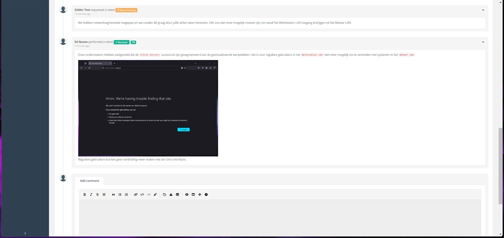 Figuur 1 Onze voorbeeldklant vraagt een hertest aan en onze onderzoekers kunnen vrijwel direct aan de slag om dit te verifiëren, te voorzien van bewijs en de status aan te passen.