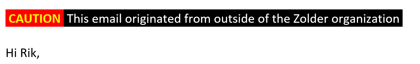 You can add text or html to any email from outside of the company. This allows you to add a warning to emails from external sources. Which could help users identify false messages. We’ve added the script to our Github repository, use it to add this to your o365 environment. You can add your own organisation name, the layout looks like this: