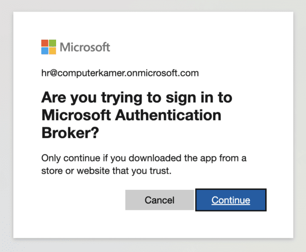 After login user receives a form asking: “Are you trying to sign in to Microsoft Authentication Broker?”.