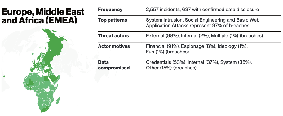 Over regionale verschillen gesproken, is nog wel interessant dat DBIR over de gehele dataset vaststelt dat in 85% van de gevallen de actor een externe is. Maar in onze regio (EMEA) is dit het beeld: