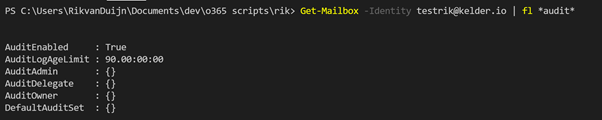 “Set-Mailbox -Identity [email protected] -AuditEnabled $true -AuditOwner @() -AuditDelegate @() -AuditAdmin @()”