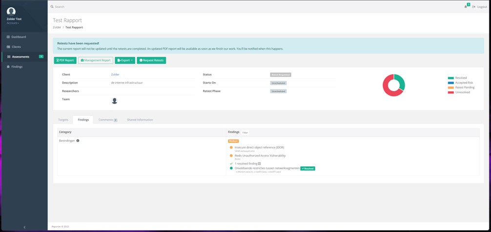 Maar wat gebeurt er daarna? Zonder verdere begeleiding of communicatie belandt dit rapport vaak in een (digitale) la, slechts af en toe geraadpleegd en zelden volledig geïmplementeerd. Laat staan dat de oplossingen ge-hertest worden. Bij Zolder streven we ernaar onze klanten te helpen naar een hoger securityniveau en niet slechts naar informatieverstrekking. Daarom maken we sinds kort gebruik van een portaal. Dit platform is ontworpen om de traditionele tekortkomingen te overbruggen en pentesting naar een nieuw niveau van betrokkenheid en efficiëntie te tillen, met de volgende doelen: