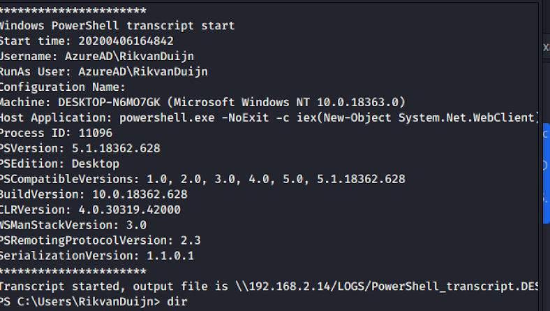 The above start-up command downloads and executes a PowerShell script, for my testcase from localhost. The script it downloads can be anything but since we want to snoop we instruct the PowerShell window to log all executed commands and output of the commands to an SMB share of our choosing: